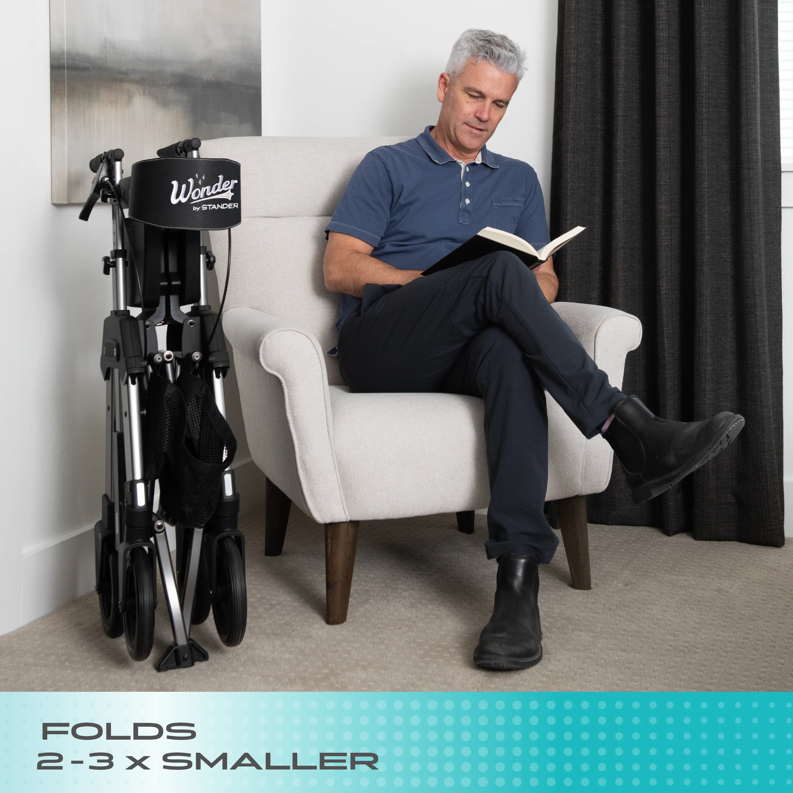 - Folds 3x smaller than the average bariatric rollator